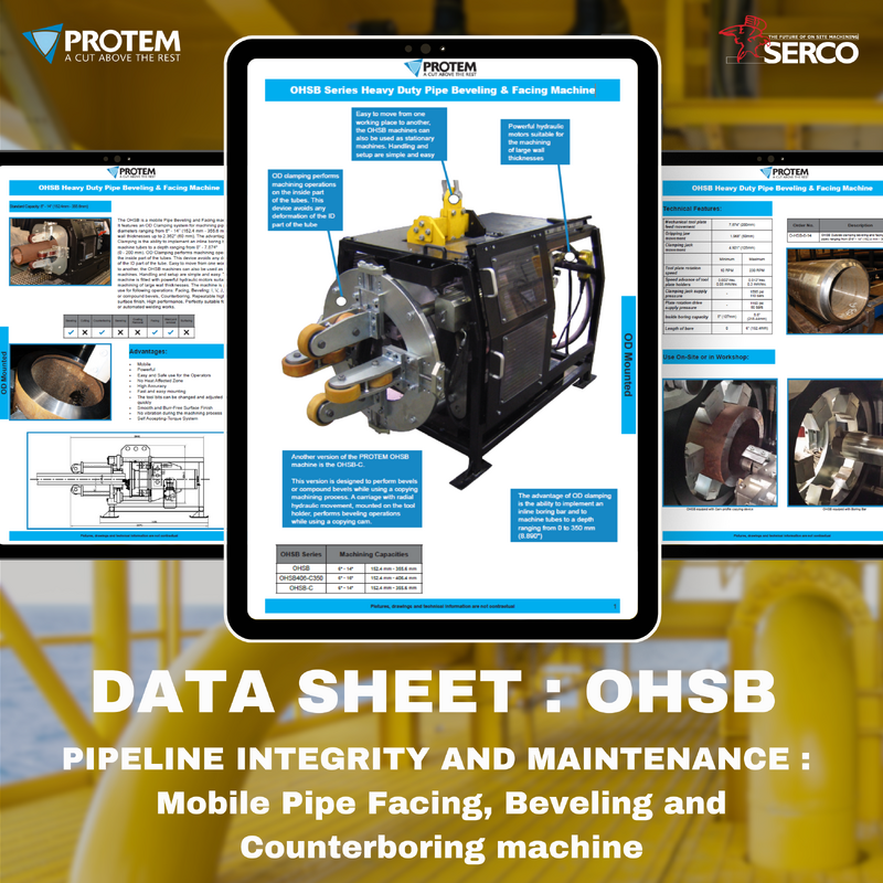 The PROTEM OHSB serie is designed for machining pipe ends from 6" to 14" OD (152.4 mm to 355.6 mm) and wall thicknesses up to 60 mm (2.362") (other sizes available on request).